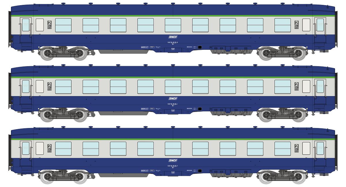 SET of 3 U52 DEV AO Sleeping Cars B9c9, Blue/Grey, boxed SNCF logo Era IV-V
